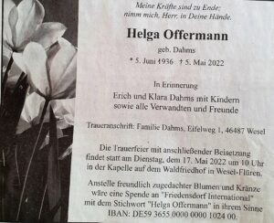 Helga Offermann wurde als kompetente und beliebte Mitarbeiterin in der Fernmelderechnungsstelle auch wegen ihrer Hilfsbereitschaft im Kollegenkreis sehr geschätzt.