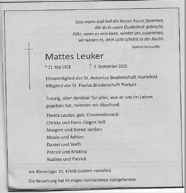 Matthias (Mattes) Leuker war lange Jahre beim ehemaligen Baubezirk 23 in Geldern beschäftigt unter anderem als Bautruppführer und später als Bauführer.